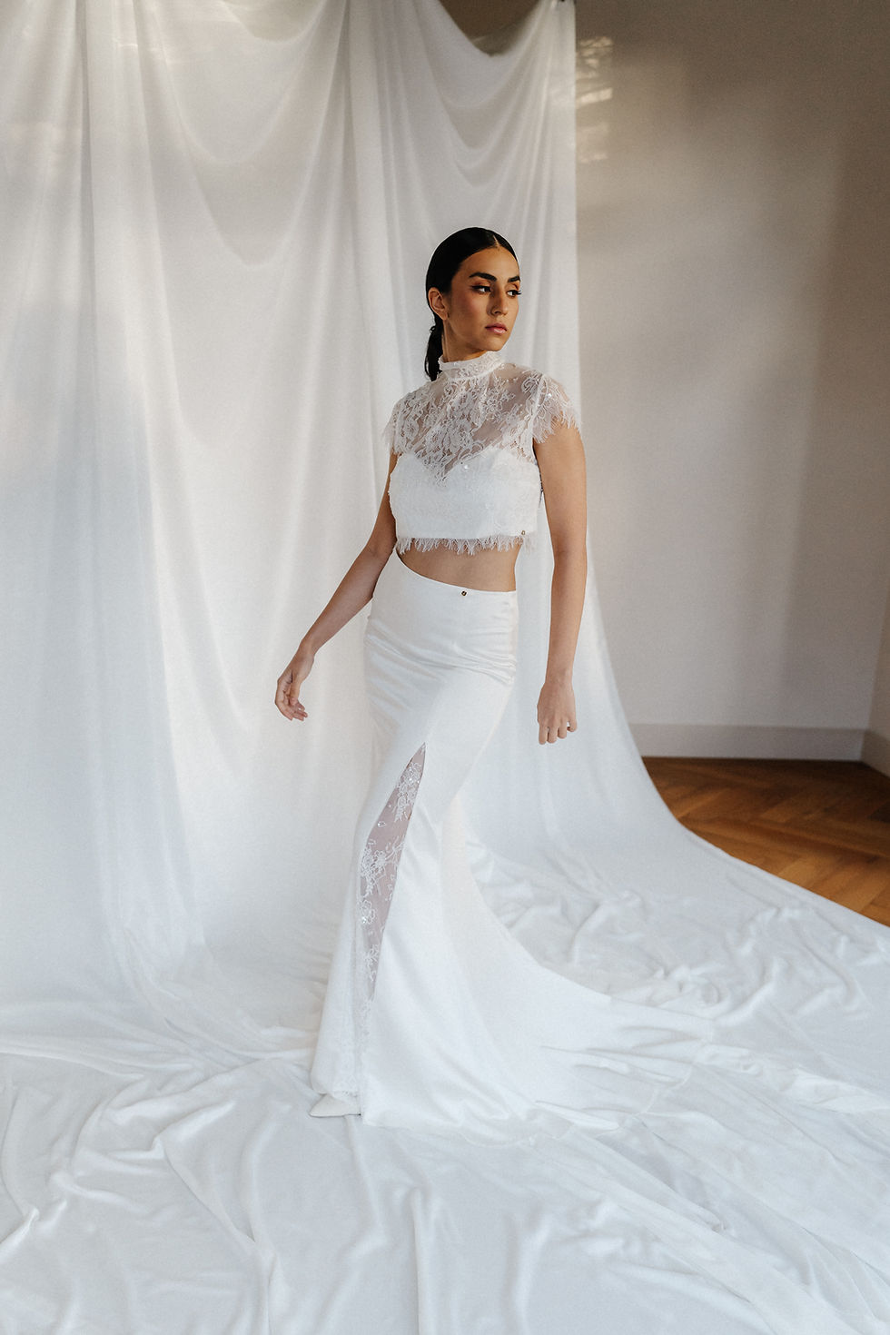 Besonders unsere Zweiteiler-Brautkleider sind ein Gamechanger: morgens elegant im Standesamt, abends cool gestylt auf der Tanzfläche – ein Look, viele Möglichkeiten.